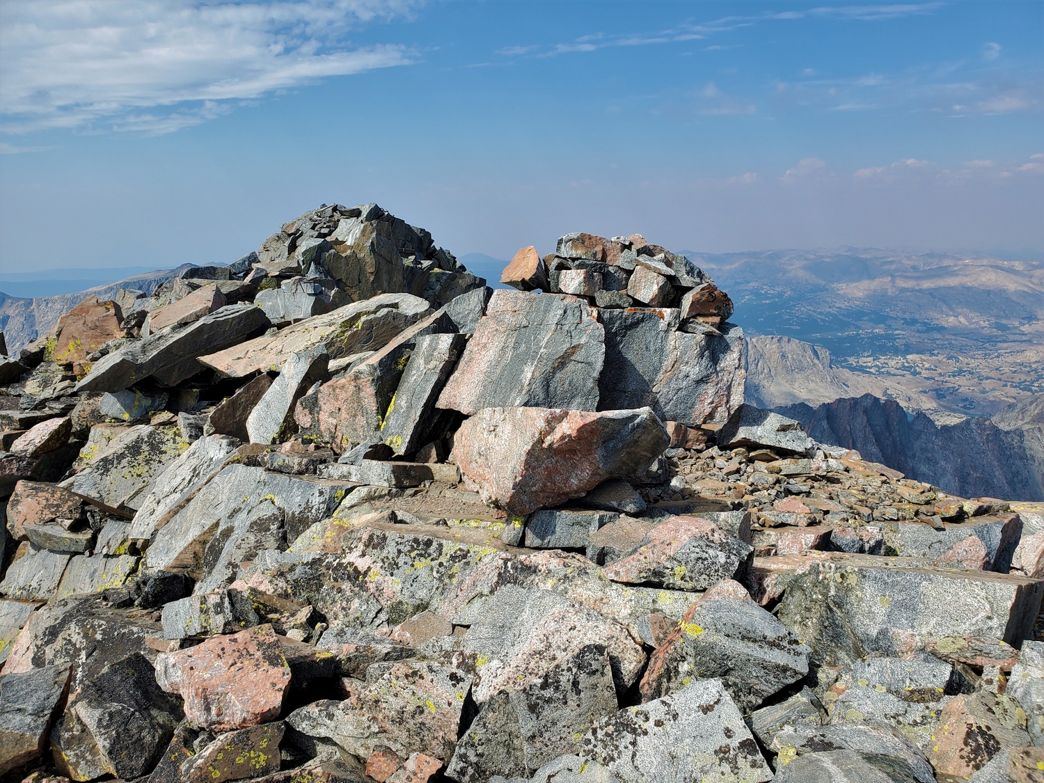 As I began the climb up Cloud Peak around 11,000 ft., the cold front arrived in force. It started raining heavily. Dense clouds socked in the valleys, gusty winds ripped across the ridges, and the temperature plummeted. I was terrified I would hear thunder any moment–not so much that I would be hit, but that I would be forced with the terrible decision of giving up or climbing the highest peak in the range during a lightning storm. Thankfully, it was still early morning, and there wasn’t much convection yet. I stopped for a moment to put on rain gear. I had left my rain pants in Reno, not expecting to climb through a storm, but when we noticed the weather was turning a few days ago, my dad had kindly picked up a pair, which I was very glad to use now. The initial downpour only lasted maybe 10-15 minutes, but it was enough water to drench the talus. Lichen-covered rocks are surprisingly slippery when wet, and I tried to move cautiously but quickly toward the summit, hoping to make it before the next squall.